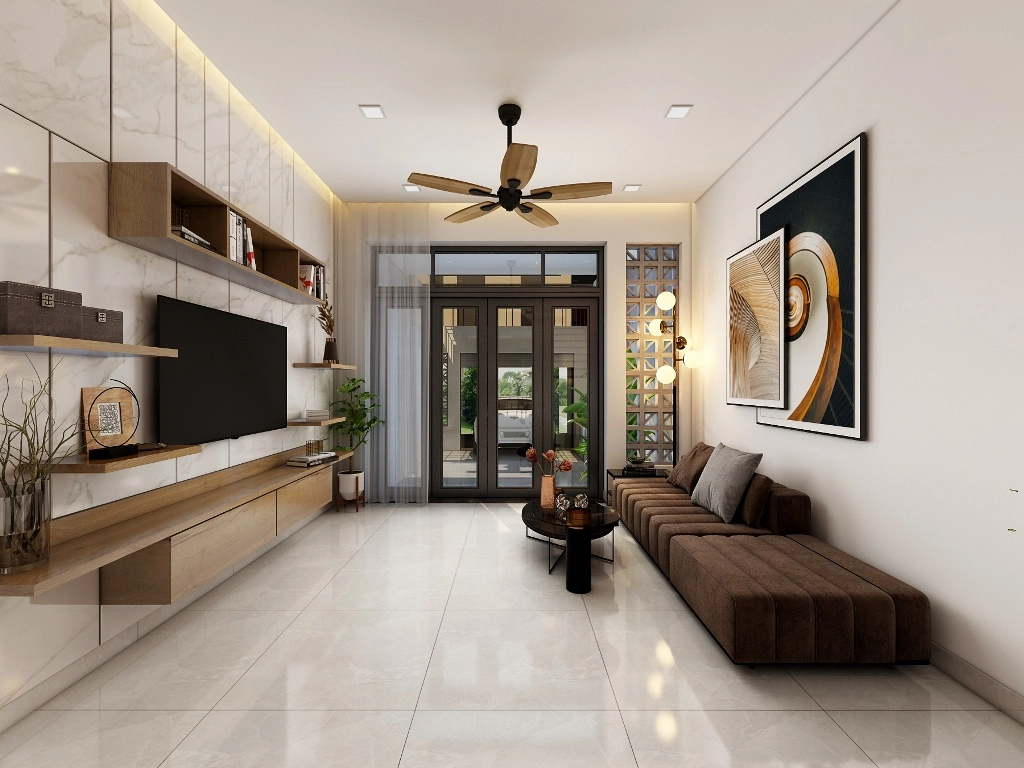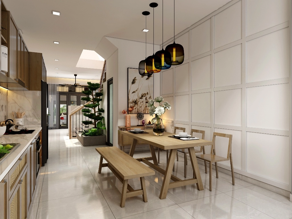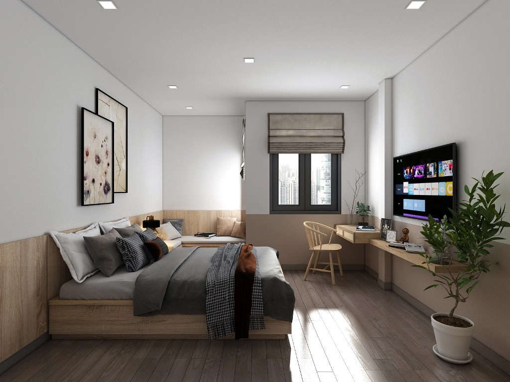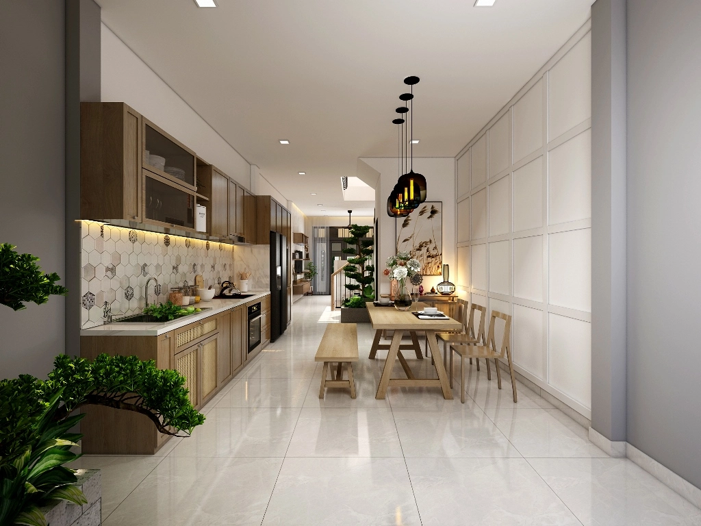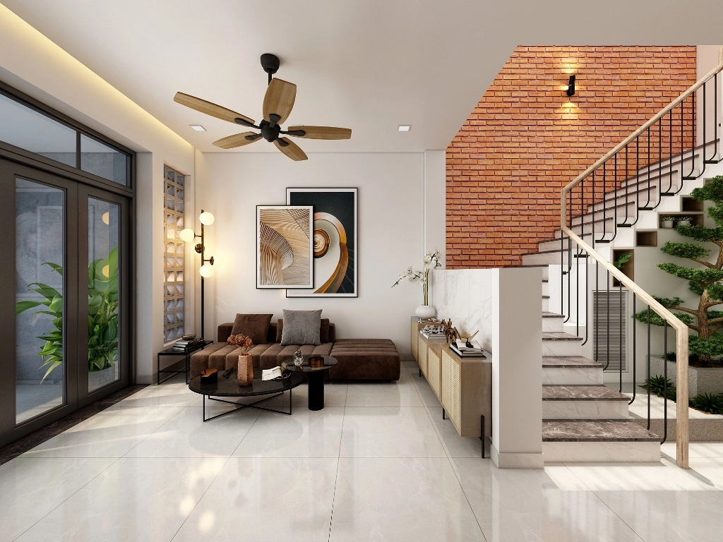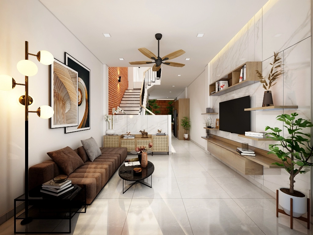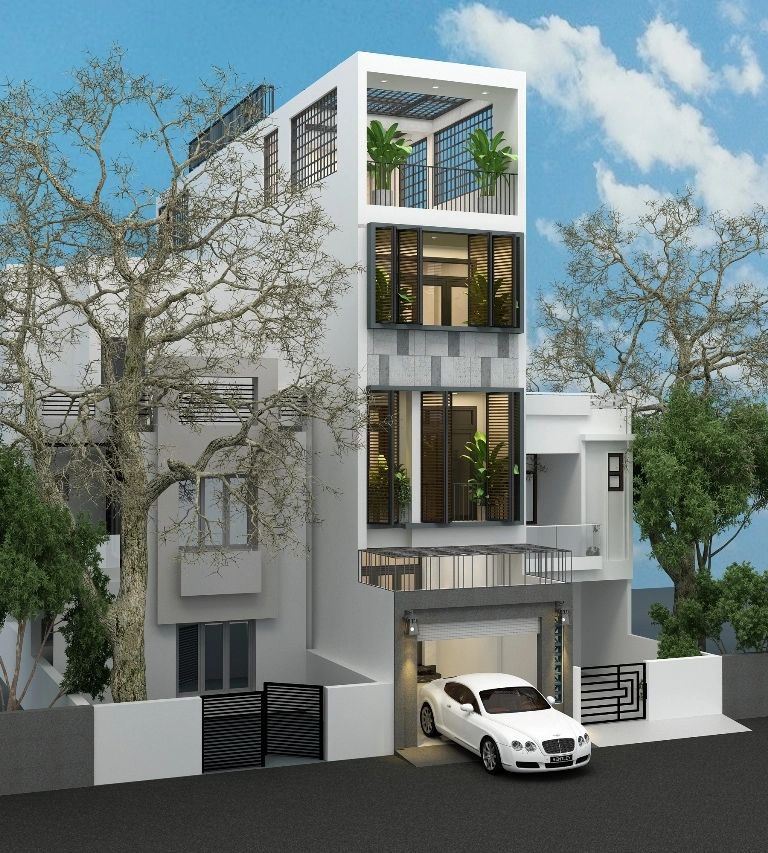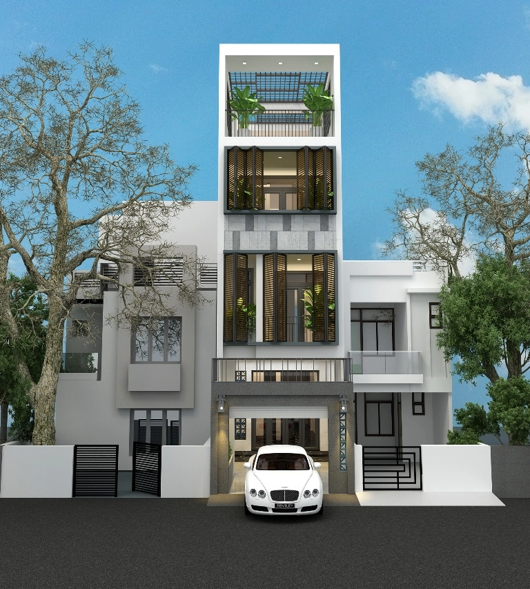 Một căn nhà phố tại một thành phố sầm uất nhất nước hiện nay. Tọa lạc ở vị trí gần các trung tâm thương mại, nơi mà thị trường đang phát triển vượt bậc ở TP. Hướng nhà chính rất nắng (hướng Tây) nên chúng tôi mang đến một kiểu dáng kiến trúc nhằm làm dịu đi sức nóng của tự nhiên. Tô điểm chính cho kiến trúc là các cánh cửa lam gió chống nắng, tạo thông thoáng, làm mát lại mặt tiền nhà. Bên cạnh đó kết hợp thêm màu sắc vật liệu (màu sáng, vật liệu chịu nóng) để làm giảm nhiệt độ về đêm cho căn nhà. Phong cách thiết kế nội thất bên trong căn nhà cũng là yếu tố được chúng tối chú ý và hướng đến để đêm lại sản phẩm tốt nhất cho gia chủ. Phong cách thiết kế rất mộc và tối giản, màu sắc phù hợp với các độ tuổi thành viên trong gia đình. Nổi bậc nhất là các thiết kế cho các phòng trẻ em. Một phòng ngủ kết hợp phòng học, vui chơi gói gọn trong một không gian nhỏ nhưng đầy đủ tiện nghi.